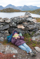 Aujourd’hui, nous avons une randonnée facile au programme : vers le sommet Keipen à partir des lacs Aunvatnan. Les filles ayant grandi sous les tropiques, elles vivent leur premier automne et s’extasient devant les couleurs ! Au début de la balade, nous sommes entourés entre autres de bouleaux aux troncs blancs et aux feuilles jaunes, et de pieds de myrtilles aux petites feuilles rouges. À mesure que nous grimpons, la végétation devient plus basse avec de la mousse et des lichens. Nous atteignons rapidement le sommet à 450m d’altitude, où nous attendent une vue à 360°, mais aussi un vent à décorner les bœufs ! La falaise tombe à pic au-dessus de la mer ! Nous pique-niquons près du lac Keipvatnan, mais renonçons à l’unanimité au dessert tellement le vent est glacial.