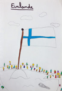 Le drapeau de la Finlande, avec comme illustration, la forêt colorée d’automne, les lacs, et un petit phoque d’eau douce annelé de Saimaa !
