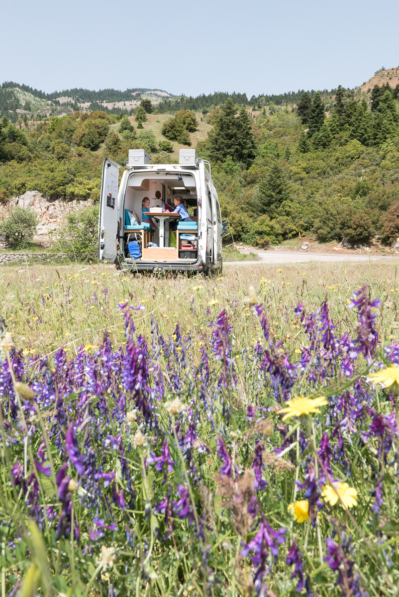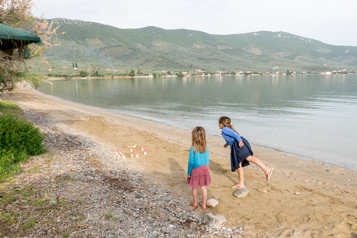 Nous y sommes tellement bien que nous restons une journée sur place, à profiter. Les filles sautent dans l’eau toute la journée, ne font pas des châteaux de sable, mais des « Météores de sable », se transforment en sirènes. Pendant qu’Annika et Niko partent découvrir une maison abandonnée sur une presqu’île (emplacement idyllique, on veut bien la racheter !), Mila se dirige vers un couple grec installé sur la plage pour leur souhaiter « kalimera » (bonjour).