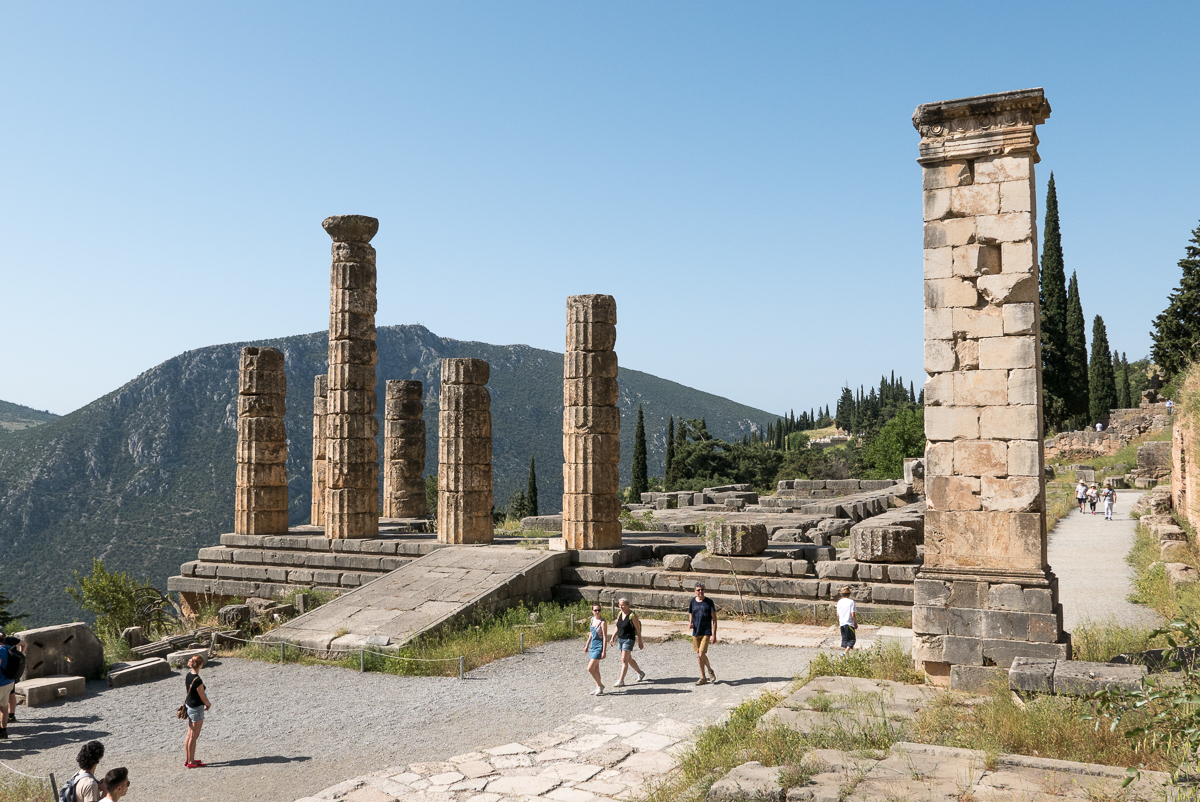Comme les pèlerins d’autrefois, nous arrivons en contrebas du site et grimpons par la voie sacrée qui a gardé son tracé d’origine. Les boutiques permettaient d’acheter des offrandes pour la Pythie, comme des galettes ou des pierres ombilicales, avant de consulter l’oracle. Viennent ensuite les petits temples appelés « trésors », offerts par les cités comme Siphnos ou Athènes, et où étaient conservés les trésors de guerre. Il ne reste pas grand-chose de ces édifices à part le trésor des Athéniens, restauré, mais les plus belles pièces sont conservées au musée archéologique.